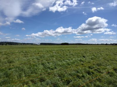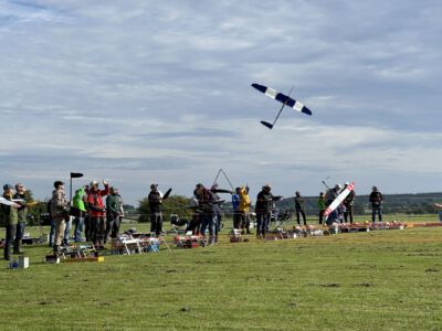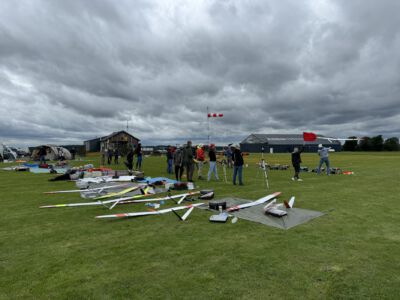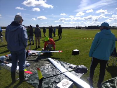 We continued with two back-to-back distance flights under similar conditions. The wind turned a bit more to the west, allowing basically both starting directions simultaneously, which was used by several pilots. Due to the fact that flying in the south was prohibited, the options were reduced: fly closely over the hilltop we were standing on, or going away into the lee side with unknown problems on how to get back to the airfield during the last legs. The high wind speed not only allowed high ballast masses, but also required it to achieve a good glide ratio during the task. But the wind direction exactly from the side posed a problem: immediately after release of the model, there was no wind component that supported the lift of the aircraft. The first half of the each winch launch was therefore quite complicated and resulted in a lot of suboptimal launches. The fast moving thermals added to the complexity. If you got lucky, a bit of thermal activity changed your entire flight. Seeing the signs of these weather changes made the difference between the pilots, some only reaching half the legs of the group winner. And they did not necessarily fly bad, sometimes it was really just down to bad timing and not recognizing the signs. I read later that Theo Weberschock did his first distance task win, congratulations there! And then he repeated the 1000 points in his second distance flight. Very nice!