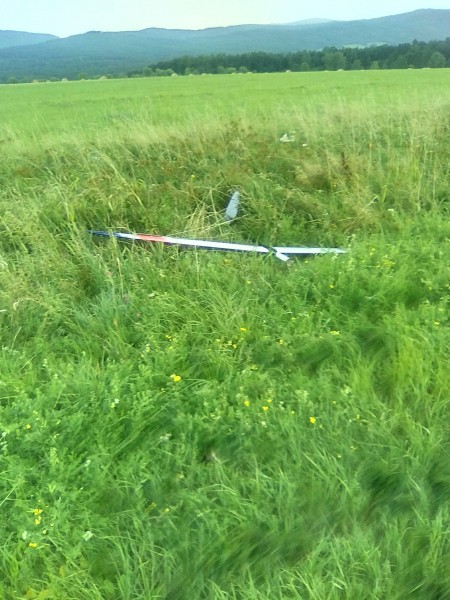 Martin hat in der letzten B – Wende beim Fliegen erkannt, daß er kein Klingelsignal erhalten würde und hat blitzschnell durch Nachdrücken (schon oft von ihm praktiziert) versucht das Signal trotzdem zu bekommen. Das Signal blieb aus und Martin schlug deutlich hinter der B-Linie ein (siehe Bilder). Das fehlende Signal war eindeutig ein Helferfehler – der Einschlag des Modells war Martins Fehler.