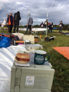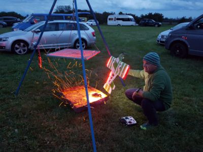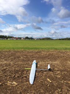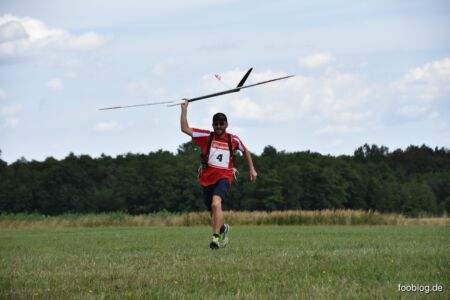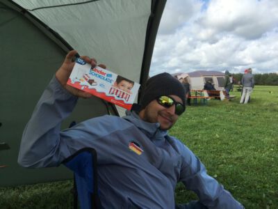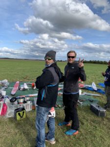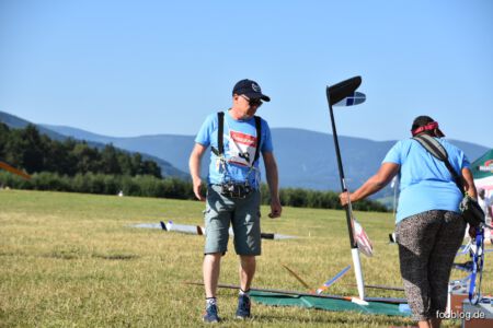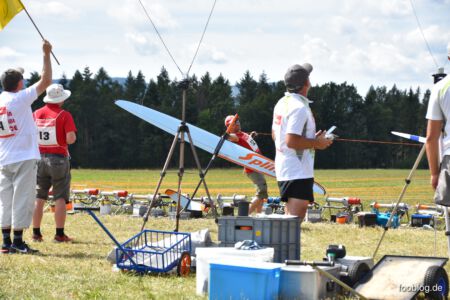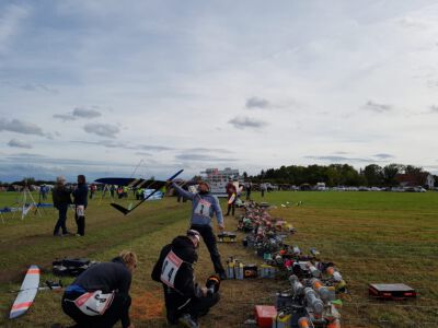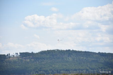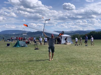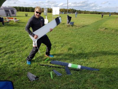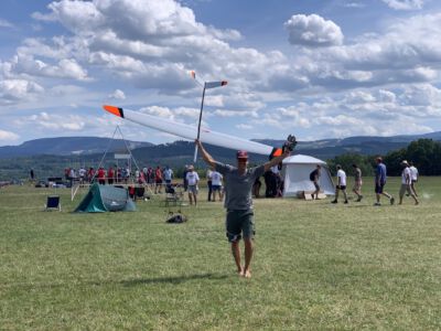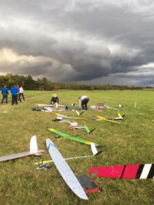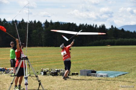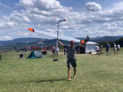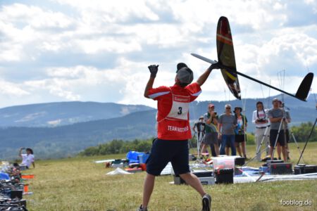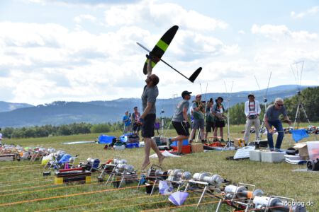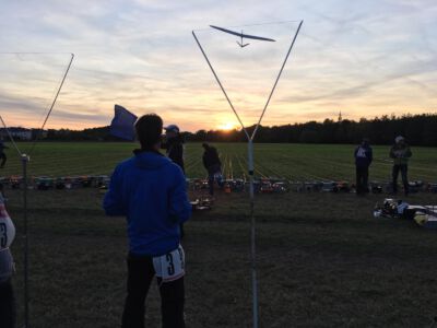 Der Sonntag Morgen begrüßte wieder mit jeder Menge Feuchtigkeit auf dem Zelt und dem Gras. Die etwas kühlere Nacht machte den deutlich lebhafteren Ostwind fast etwas unangenehm kalt – aber er bescherte zunächst gigantische Höhen von deutlich über 300 m, was den Zeitflug von Runde 2 meist zu keinem Problem werden ließ. Johannes Krischkes Modell verlor allerdings im „Schuss“ beim Start die Nase und taumelte unkontrolliert zu Boden – sicher ein bitterer Verlust.